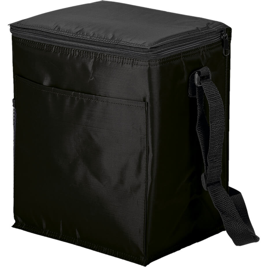 Travel with all your snack time favourite thanks to the spacious 12 Can Cooler with 2 Exterior Pockets. Made from 70D with heat-sealed PEVA lining, the cooler bag has a fully insulated main compartment with zippered closure, 12 can capacity, a front slip pocket, a side mesh pocket and an adjustable strap. Available in great colours with contrast black strip, zip and pocket detail.